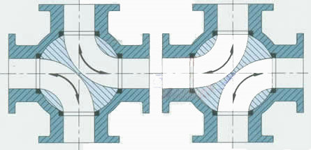 【渦輪傳動(dòng)四通球閥介質(zhì)流向示意圖】